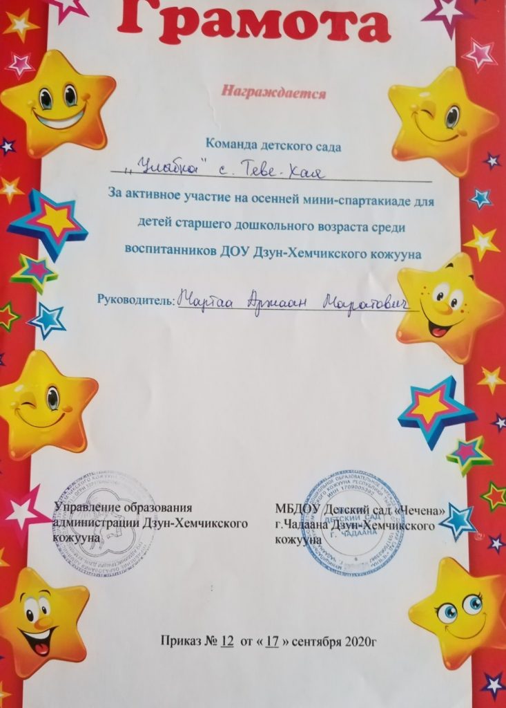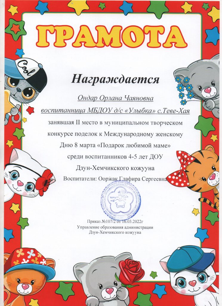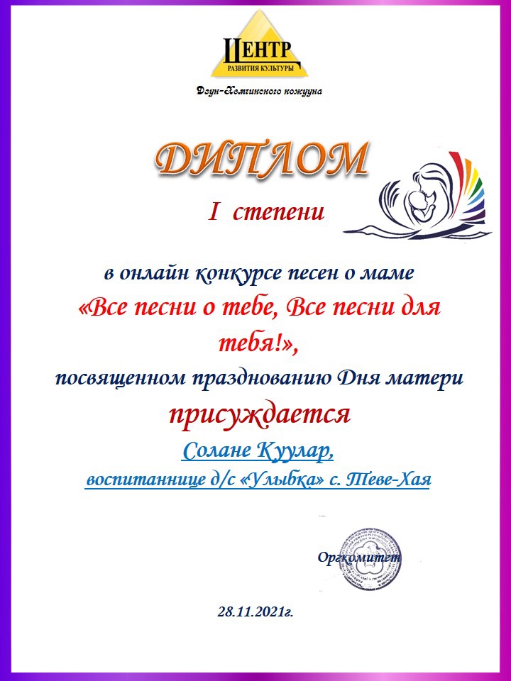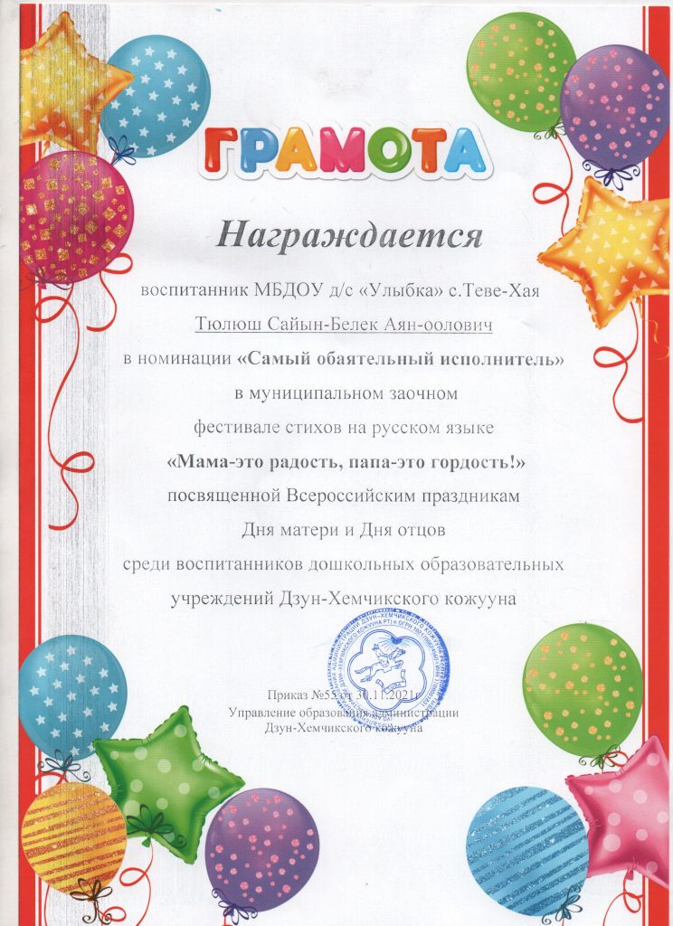 25 ноября 2021г. было проведено муниципальный заочный фестиваль сихов и песен на русском языке «Мама-это радость, папа-это гордость!» посвященному Всероссийским праздником Дня матери и Дня отцов среди воспитанников старшего дошкольного возраста кожууна. Наши воспитанники были награждены грамотами.