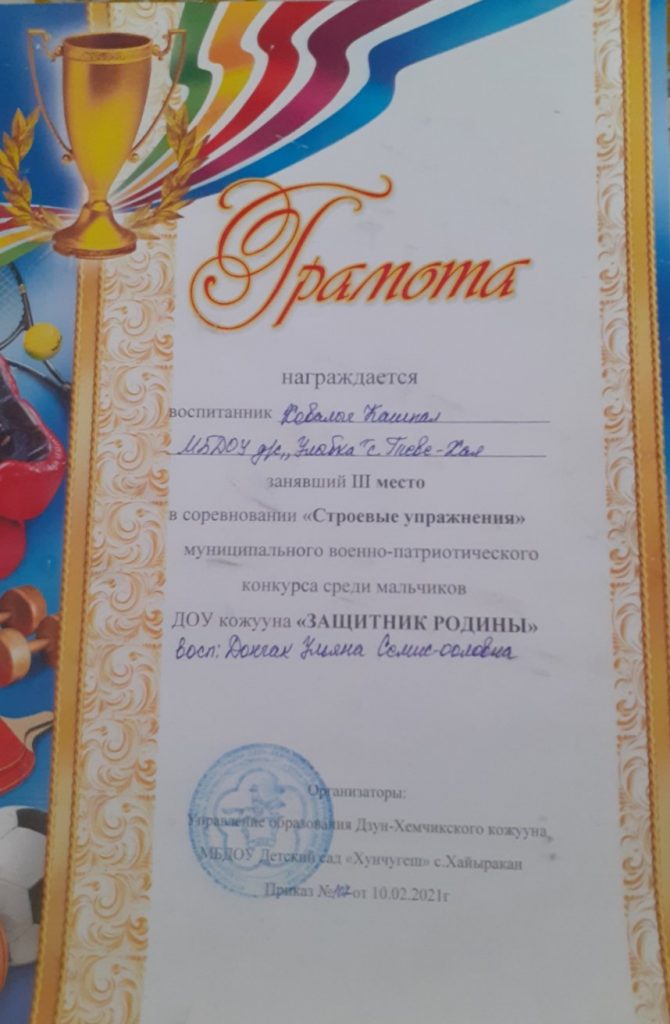 10 февраля 2021 года в спортивном зале Хайыраканской школы проведен конкурс среди мальчиков дошкольного возраста «Защитник Родины» в честь празднования Дня Защитника Отечества. Наш воспитанник подготовительной группы Ховалыг Кашпал принял участие и завоевал III место в соревновании «Строевые упражнения»
