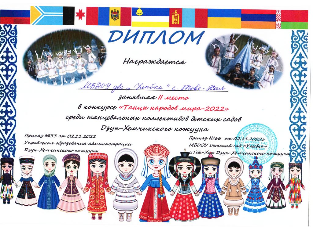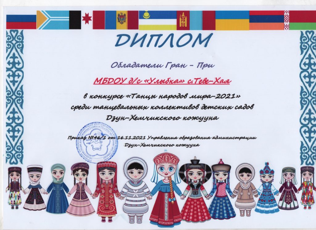 16 ноября 2021г в нашем кожууне вместе с детский сад Родничок администрация управления образования был проведен конкурс «Танцы народов мира» среди старших и подготовительных групп. Наша танцевальная группа исполнили Якутский народный танец «Северных оленей» в итоге получили Гран-При.